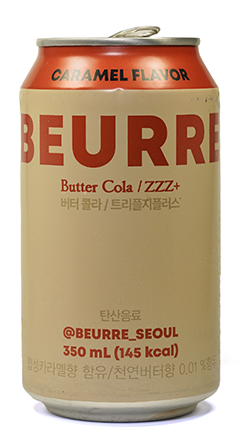 2023年に韓国で発売されたフレーバーコーラ。 「BEURRE(ブール)」は韓国Virtual Company が2022年に立ち上げたバターフレーバー食品ブランドで、スナックやアイスクリーム・海苔などを展開。中でもバター風味のビールBEURRE Beerは大きな話題を呼んだ。本品はBEURREの飲料シリーズの一つで、ビールや焼酎と同様に固有の3連アルファベット(ZZZ+)がつけられている。製造はIlhwaが担当する。 舌に残るほどのがっつりとしたキャラメルフレーバーで、後のバターがほのかに香る。炭酸は控えめ。キャラメル+砂糖のしっかりとした甘さの中で、強めの酸味がアクセントになっている。 一時期日本にも輸入されファッションブランドとのコラボも実施したが、現在は販売終了している。 |